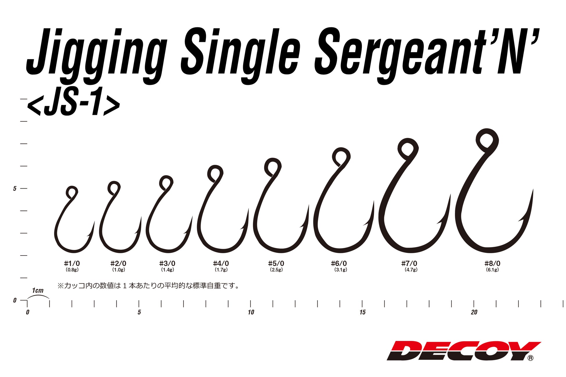 The JS-1 J Single Sergeant'N' is a specialized single hook designed for jigging, stickbaits, and trolling lures. Its back-shifted wide eye and smart eye design ensure high hookup rates and secure attachment. The massive wire and round wide gape stimulate aggressive strikes and ensure strong, reliable performance even in challenging conditions. This hook is suitable for a variety of jigging applications, making it ideal for targeting species like amberjack, tuna, and grouper.
