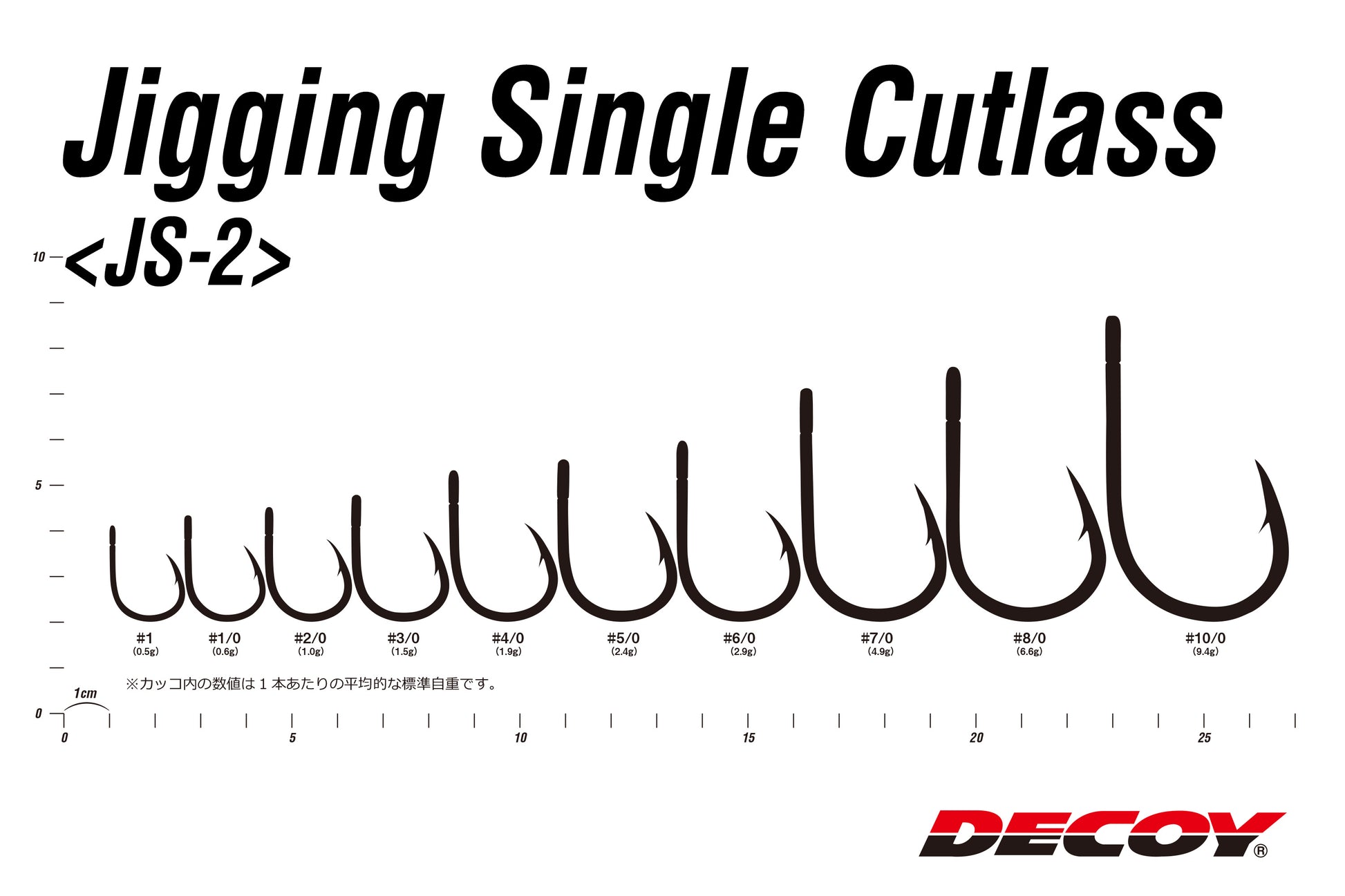 The JS-2 Jigging Single Cutlass is a versatile hook designed for use with stickbaits, poppers, and jigging. For sizes #1 to #6/0, the hook is made from M2J material and features a DTM (Double Tapered Method) point for superior strength and penetration. Sizes #7/0 to #10/0 use M1J material and feature a welded eye for maximum strength. The hook's Micro Barb reduces damage to fish and increases hook penetration. The Solid System finish prevents rust and ensures a smooth, reliable performance.